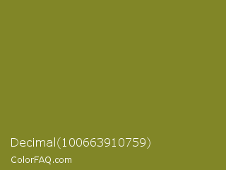 Decimal 100663910759 Color is a normal yellow color and the nearest color is Wasabi #788a25. Hex code #818627 and RGB value is rgb(129,134,39). In RGB color space, this color is composed of 51% red, 53% green, 15% blue, In CMYK color space, this color is composed of 4% cyan, 0% magenta, 71% yellow , 47% black , In HSL color space, this color has a hue angle of 63° , 55% saturation and 34% lightness.