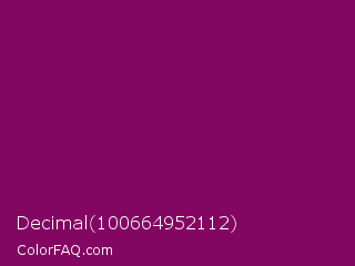Decimal 100664952112 Color is a dark magenta color and the nearest color is Cardinal Pink #8c055e. Hex code #830662 and RGB value is rgb(131,6,98). In RGB color space, this color is composed of 51% red, 2% green, 38% blue, In CMYK color space, this color is composed of 0% cyan, 95% magenta, 25% yellow , 49% black , In HSL color space, this color has a hue angle of 316° , 91% saturation and 27% lightness.