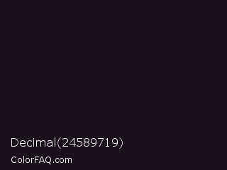 Decimal 24589719 Color is a almost black purple color and the nearest color is Vulcan #10121d. Hex code #1b101d and RGB value is rgb(27,16,29). In RGB color space, this color is composed of 11% red, 6% green, 11% blue, In CMYK color space, this color is composed of 7% cyan, 45% magenta, 0% yellow , 89% black , In HSL color space, this color has a hue angle of 291° , 29% saturation and 9% lightness.