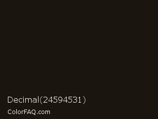 Decimal 24594531 Color is a almost black orange color and the nearest color is Licorice #1a1110. Hex code #1b150f and RGB value is rgb(27,21,15). In RGB color space, this color is composed of 11% red, 8% green, 6% blue, In CMYK color space, this color is composed of 0% cyan, 22% magenta, 44% yellow , 89% black , In HSL color space, this color has a hue angle of 30° , 29% saturation and 8% lightness.