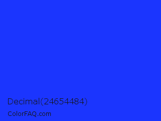 Decimal 24654484 Color is a normal blue color and the nearest color is Bluebonnet #1c1cf0. Hex code #1b35fe and RGB value is rgb(27,53,254). In RGB color space, this color is composed of 11% red, 21% green, 100% blue, In CMYK color space, this color is composed of 89% cyan, 79% magenta, 0% yellow , 0% black , In HSL color space, this color has a hue angle of 233° , 99% saturation and 55% lightness.