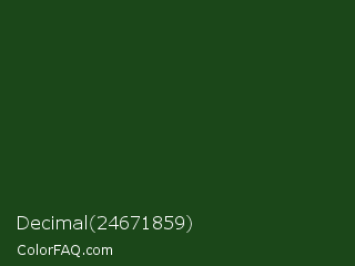Decimal 24671859 Color is a very dark green color and the nearest color is Parsley #134f19. Hex code #1b4719 and RGB value is rgb(27,71,25). In RGB color space, this color is composed of 11% red, 28% green, 10% blue, In CMYK color space, this color is composed of 62% cyan, 0% magenta, 65% yellow , 72% black , In HSL color space, this color has a hue angle of 117° , 48% saturation and 19% lightness.