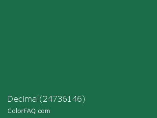 Decimal 24736146 Color is a dark green color and the nearest color is Dark Spring Green #177245. Hex code #1b6c48 and RGB value is rgb(27,108,72). In RGB color space, this color is composed of 11% red, 42% green, 28% blue, In CMYK color space, this color is composed of 75% cyan, 0% magenta, 33% yellow , 58% black , In HSL color space, this color has a hue angle of 153° , 60% saturation and 26% lightness.