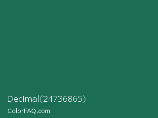 Decimal 24736865 Color is a dark green color and the nearest color is Dark Spring Green #177245. Hex code #1b6d55 and RGB value is rgb(27,109,85). In RGB color space, this color is composed of 11% red, 43% green, 33% blue, In CMYK color space, this color is composed of 75% cyan, 0% magenta, 22% yellow , 57% black , In HSL color space, this color has a hue angle of 162° , 60% saturation and 27% lightness.