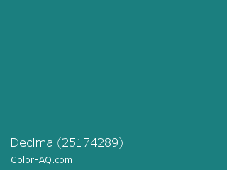 Decimal 25174289 Color is a dark cyan color and the nearest color is Elm #1c7c7d. Hex code #1b7f7f and RGB value is rgb(27,127,127). In RGB color space, this color is composed of 11% red, 50% green, 50% blue, In CMYK color space, this color is composed of 79% cyan, 0% magenta, 0% yellow , 50% black , In HSL color space, this color has a hue angle of 180° , 65% saturation and 30% lightness.