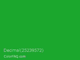 Decimal 25239572 Color is a normal green color and the nearest color is Wageningen Green #34b233. Hex code #1ba62e and RGB value is rgb(27,166,46). In RGB color space, this color is composed of 11% red, 65% green, 18% blue, In CMYK color space, this color is composed of 84% cyan, 0% magenta, 72% yellow , 35% black , In HSL color space, this color has a hue angle of 128° , 72% saturation and 38% lightness.