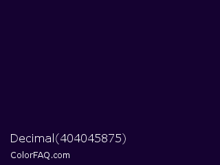 Decimal 404045875 Color is a very dark violet color and the nearest color is Black Rock #0d0332. Hex code #150231 and RGB value is rgb(21,2,49). In RGB color space, this color is composed of 8% red, 1% green, 19% blue, In CMYK color space, this color is composed of 57% cyan, 96% magenta, 0% yellow , 81% black , In HSL color space, this color has a hue angle of 264° , 92% saturation and 10% lightness.