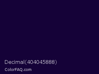Decimal 404045888 Color is a very dark violet color and the nearest color is Black Rock #0d0332. Hex code #150238 and RGB value is rgb(21,2,56). In RGB color space, this color is composed of 8% red, 1% green, 22% blue, In CMYK color space, this color is composed of 63% cyan, 96% magenta, 0% yellow , 78% black , In HSL color space, this color has a hue angle of 261° , 93% saturation and 11% lightness.