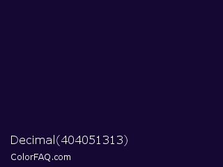 Decimal 404051313 Color is a very dark indigo color and the nearest color is Black Rock #0d0332. Hex code #150833 and RGB value is rgb(21,8,51). In RGB color space, this color is composed of 8% red, 3% green, 20% blue, In CMYK color space, this color is composed of 59% cyan, 84% magenta, 0% yellow , 80% black , In HSL color space, this color has a hue angle of 258° , 73% saturation and 12% lightness.