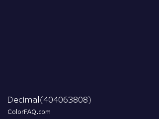 Decimal 404063808 Color is a very dark indigo color and the nearest color is Haiti #1b1035. Hex code #151430 and RGB value is rgb(21,20,48). In RGB color space, this color is composed of 8% red, 8% green, 19% blue, In CMYK color space, this color is composed of 56% cyan, 58% magenta, 0% yellow , 81% black , In HSL color space, this color has a hue angle of 242° , 41% saturation and 13% lightness.