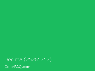 Decimal 25261717 Color is a normal green color and the nearest color is Green Crayola #1cac78. Hex code #1bbc5f and RGB value is rgb(27,188,95). In RGB color space, this color is composed of 11% red, 74% green, 37% blue, In CMYK color space, this color is composed of 86% cyan, 0% magenta, 49% yellow , 26% black , In HSL color space, this color has a hue angle of 145° , 75% saturation and 42% lightness.