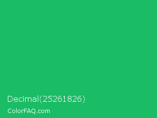 Decimal 25261826 Color is a normal green color and the nearest color is Green Crayola #1cac78. Hex code #1bbc66 and RGB value is rgb(27,188,102). In RGB color space, this color is composed of 11% red, 74% green, 40% blue, In CMYK color space, this color is composed of 86% cyan, 0% magenta, 46% yellow , 26% black , In HSL color space, this color has a hue angle of 148° , 75% saturation and 42% lightness.
