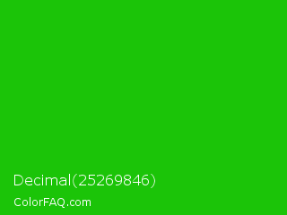 Decimal 25269846 Color is a normal green color and the nearest color is Harlequin Green #46cb18. Hex code #1bc408 and RGB value is rgb(27,196,8). In RGB color space, this color is composed of 11% red, 77% green, 3% blue, In CMYK color space, this color is composed of 86% cyan, 0% magenta, 96% yellow , 23% black , In HSL color space, this color has a hue angle of 114° , 92% saturation and 40% lightness.