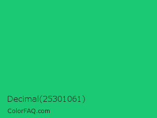 Decimal 25301061 Color is a normal green color and the nearest color is Mountain Meadow Crayola #1ab385. Hex code #1bc975 and RGB value is rgb(27,201,117). In RGB color space, this color is composed of 11% red, 79% green, 46% blue, In CMYK color space, this color is composed of 87% cyan, 0% magenta, 42% yellow , 21% black , In HSL color space, this color has a hue angle of 151° , 76% saturation and 45% lightness.
