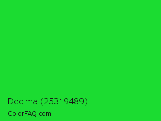 Decimal 25319489 Color is a normal green color and the nearest color is Lime Green #32cd32. Hex code #1bdc31 and RGB value is rgb(27,220,49). In RGB color space, this color is composed of 11% red, 86% green, 19% blue, In CMYK color space, this color is composed of 88% cyan, 0% magenta, 78% yellow , 14% black , In HSL color space, this color has a hue angle of 127° , 78% saturation and 48% lightness.