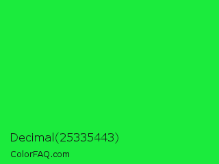Decimal 25335443 Color is a normal green color and the nearest color is Malachite #0bda51. Hex code #1beb3d and RGB value is rgb(27,235,61). In RGB color space, this color is composed of 11% red, 92% green, 24% blue, In CMYK color space, this color is composed of 89% cyan, 0% magenta, 74% yellow , 8% black , In HSL color space, this color has a hue angle of 130° , 84% saturation and 51% lightness.