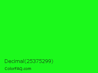 Decimal 25375299 Color is a normal green color and the nearest color is Neon Green #39ff14. Hex code #1bf91b and RGB value is rgb(27,249,27). In RGB color space, this color is composed of 11% red, 98% green, 11% blue, In CMYK color space, this color is composed of 89% cyan, 0% magenta, 89% yellow , 2% black , In HSL color space, this color has a hue angle of 120° , 95% saturation and 54% lightness.