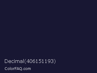 Decimal 406151193 Color is a very dark indigo color and the nearest color is Haiti #1b1035. Hex code #181733 and RGB value is rgb(24,23,51). In RGB color space, this color is composed of 9% red, 9% green, 20% blue, In CMYK color space, this color is composed of 53% cyan, 55% magenta, 0% yellow , 80% black , In HSL color space, this color has a hue angle of 242° , 38% saturation and 15% lightness.