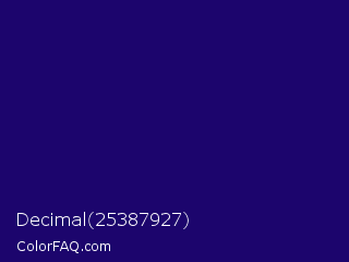 Decimal 25387927 Color is a very dark indigo color and the nearest color is Paris M #26056a. Hex code #1c056d and RGB value is rgb(28,5,109). In RGB color space, this color is composed of 11% red, 2% green, 43% blue, In CMYK color space, this color is composed of 74% cyan, 95% magenta, 0% yellow , 57% black , In HSL color space, this color has a hue angle of 253° , 91% saturation and 22% lightness.
