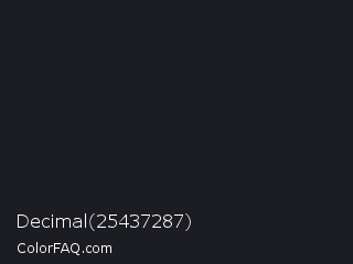Decimal 25437287 Color is a very dark blue color and the nearest color is Dark Jungle Green #1a2421. Hex code #1c1d23 and RGB value is rgb(28,29,35). In RGB color space, this color is composed of 11% red, 11% green, 14% blue, In CMYK color space, this color is composed of 20% cyan, 17% magenta, 0% yellow , 86% black , In HSL color space, this color has a hue angle of 231° , 11% saturation and 12% lightness.