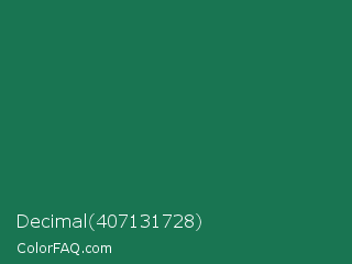 Decimal 407131728 Color is a dark green color and the nearest color is Dark Spring Green #177245. Hex code #197552 and RGB value is rgb(25,117,82). In RGB color space, this color is composed of 10% red, 46% green, 32% blue, In CMYK color space, this color is composed of 79% cyan, 0% magenta, 30% yellow , 54% black , In HSL color space, this color has a hue angle of 157° , 65% saturation and 28% lightness.