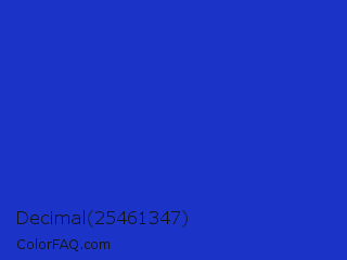 Decimal 25461347 Color is a normal blue color and the nearest color is Persian Blue #1c39bb. Hex code #1c33c7 and RGB value is rgb(28,51,199). In RGB color space, this color is composed of 11% red, 20% green, 78% blue, In CMYK color space, this color is composed of 86% cyan, 74% magenta, 0% yellow , 22% black , In HSL color space, this color has a hue angle of 232° , 75% saturation and 45% lightness.