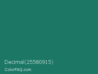 Decimal 25580915 Color is a dark cyan color and the nearest color is Genoa #15736b. Hex code #1c7765 and RGB value is rgb(28,119,101). In RGB color space, this color is composed of 11% red, 47% green, 40% blue, In CMYK color space, this color is composed of 76% cyan, 0% magenta, 15% yellow , 53% black , In HSL color space, this color has a hue angle of 168° , 62% saturation and 29% lightness.