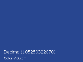 Decimal 105250322070 Color is a normal blue color and the nearest color is Chambray #354e8c. Hex code #284690 and RGB value is rgb(40,70,144). In RGB color space, this color is composed of 16% red, 27% green, 56% blue, In CMYK color space, this color is composed of 72% cyan, 51% magenta, 0% yellow , 44% black , In HSL color space, this color has a hue angle of 223° , 57% saturation and 36% lightness.