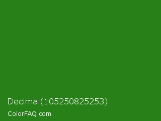 Decimal 105250825253 Color is a dark green color and the nearest color is Bilbao #327c14. Hex code #288019 and RGB value is rgb(40,128,25). In RGB color space, this color is composed of 16% red, 50% green, 10% blue, In CMYK color space, this color is composed of 69% cyan, 0% magenta, 80% yellow , 50% black , In HSL color space, this color has a hue angle of 111° , 67% saturation and 30% lightness.