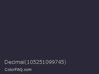 Decimal 105251099745 Color is a very dark indigo color and the nearest color is Charade #292937. Hex code #292835 and RGB value is rgb(41,40,53). In RGB color space, this color is composed of 16% red, 16% green, 21% blue, In CMYK color space, this color is composed of 23% cyan, 25% magenta, 0% yellow , 79% black , In HSL color space, this color has a hue angle of 245° , 14% saturation and 18% lightness.
