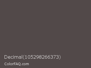 Decimal 105298266373 Color is a dark red color and the nearest color is Emperor #514649. Hex code #524949 and RGB value is rgb(82,73,73). In RGB color space, this color is composed of 32% red, 29% green, 29% blue, In CMYK color space, this color is composed of 0% cyan, 11% magenta, 11% yellow , 68% black , In HSL color space, this color has a hue angle of 0° , 6% saturation and 30% lightness.