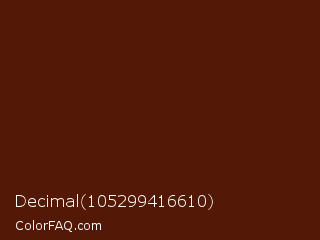 Decimal 105299416610 Color is a very dark color and the nearest color is French Puce #4e1609. Hex code #541906 and RGB value is rgb(84,25,6). In RGB color space, this color is composed of 33% red, 10% green, 2% blue, In CMYK color space, this color is composed of 0% cyan, 70% magenta, 93% yellow , 67% black , In HSL color space, this color has a hue angle of 15° , 87% saturation and 18% lightness.