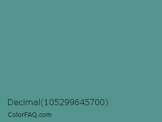 Decimal 105299645700 Color is a normal cyan color and the nearest color is Patina #639a8f. Hex code #549590 and RGB value is rgb(84,149,144). In RGB color space, this color is composed of 33% red, 58% green, 56% blue, In CMYK color space, this color is composed of 44% cyan, 0% magenta, 3% yellow , 42% black , In HSL color space, this color has a hue angle of 175° , 28% saturation and 46% lightness.