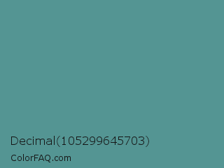 Decimal 105299645703 Color is a normal cyan color and the nearest color is Patina #639a8f. Hex code #549593 and RGB value is rgb(84,149,147). In RGB color space, this color is composed of 33% red, 58% green, 58% blue, In CMYK color space, this color is composed of 44% cyan, 0% magenta, 1% yellow , 42% black , In HSL color space, this color has a hue angle of 178° , 28% saturation and 46% lightness.