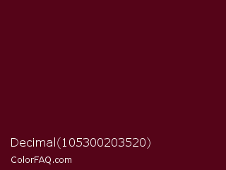 Decimal 105300203520 Color is a very dark red color and the nearest color is Dark Scarlet #560319. Hex code #550418 and RGB value is rgb(85,4,24). In RGB color space, this color is composed of 33% red, 2% green, 9% blue, In CMYK color space, this color is composed of 0% cyan, 95% magenta, 72% yellow , 67% black , In HSL color space, this color has a hue angle of 345° , 91% saturation and 17% lightness.