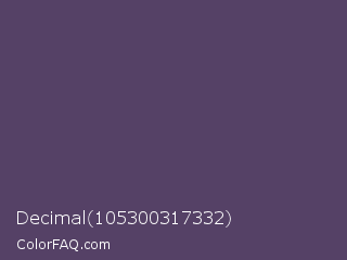 Decimal 105300317332 Color is a normal purple color and the nearest color is Mulled Wine #4e4562. Hex code #554166 and RGB value is rgb(85,65,102). In RGB color space, this color is composed of 33% red, 25% green, 40% blue, In CMYK color space, this color is composed of 17% cyan, 36% magenta, 0% yellow , 60% black , In HSL color space, this color has a hue angle of 272° , 22% saturation and 33% lightness.