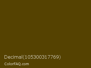 Decimal 105300317769 Color is a very dark yellow color and the nearest color is Bronze Olive #4e420c. Hex code #554201 and RGB value is rgb(85,66,1). In RGB color space, this color is composed of 33% red, 26% green, 0% blue, In CMYK color space, this color is composed of 0% cyan, 22% magenta, 99% yellow , 67% black , In HSL color space, this color has a hue angle of 46° , 98% saturation and 17% lightness.