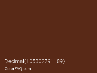 Decimal 105302791189 Color is a very dark orange color and the nearest color is Espresso #612718. Hex code #592917 and RGB value is rgb(89,41,23). In RGB color space, this color is composed of 35% red, 16% green, 9% blue, In CMYK color space, this color is composed of 0% cyan, 54% magenta, 74% yellow , 65% black , In HSL color space, this color has a hue angle of 16° , 59% saturation and 22% lightness.