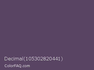 Decimal 105302820441 Color is a normal purple color and the nearest color is Mulled Wine #4e4562. Hex code #594563 and RGB value is rgb(89,69,99). In RGB color space, this color is composed of 35% red, 27% green, 39% blue, In CMYK color space, this color is composed of 10% cyan, 30% magenta, 0% yellow , 61% black , In HSL color space, this color has a hue angle of 280° , 18% saturation and 33% lightness.