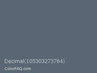 Decimal 105303273764 Color is a normal blue color and the nearest color is Shuttle Gray #5f6672. Hex code #596674 and RGB value is rgb(89,102,116). In RGB color space, this color is composed of 35% red, 40% green, 45% blue, In CMYK color space, this color is composed of 23% cyan, 12% magenta, 0% yellow , 55% black , In HSL color space, this color has a hue angle of 211° , 13% saturation and 40% lightness.