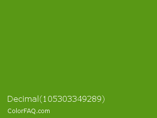 Decimal 105303349289 Color is a normal green color and the nearest color is Vida Loca #549019. Hex code #599815 and RGB value is rgb(89,152,21). In RGB color space, this color is composed of 35% red, 60% green, 8% blue, In CMYK color space, this color is composed of 41% cyan, 0% magenta, 86% yellow , 40% black , In HSL color space, this color has a hue angle of 89° , 76% saturation and 34% lightness.