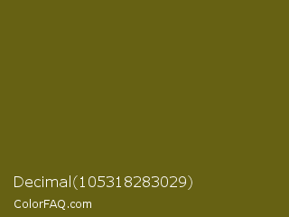 Decimal 105318283029 Color is a dark yellow color and the nearest color is Himalaya #6a5d1b. Hex code #666113 and RGB value is rgb(102,97,19). In RGB color space, this color is composed of 40% red, 38% green, 7% blue, In CMYK color space, this color is composed of 0% cyan, 5% magenta, 81% yellow , 60% black , In HSL color space, this color has a hue angle of 56° , 69% saturation and 24% lightness.