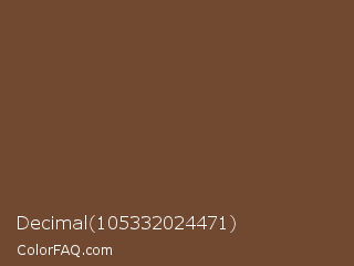 Decimal 105332024471 Color is a normal orange color and the nearest color is Old Copper #724a2f. Hex code #714931 and RGB value is rgb(113,73,49). In RGB color space, this color is composed of 44% red, 29% green, 19% blue, In CMYK color space, this color is composed of 0% cyan, 35% magenta, 57% yellow , 56% black , In HSL color space, this color has a hue angle of 23° , 40% saturation and 32% lightness.