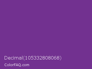 Decimal 105332808068 Color is a normal purple color and the nearest color is Rebecca Purple #663399. Hex code #723190 and RGB value is rgb(114,49,144). In RGB color space, this color is composed of 45% red, 19% green, 56% blue, In CMYK color space, this color is composed of 21% cyan, 66% magenta, 0% yellow , 44% black , In HSL color space, this color has a hue angle of 281° , 49% saturation and 38% lightness.