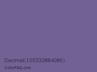 Decimal 105332884086 Color is a normal indigo color and the nearest color is Dark Blue Gray #666699. Hex code #726194 and RGB value is rgb(114,97,148). In RGB color space, this color is composed of 45% red, 38% green, 58% blue, In CMYK color space, this color is composed of 23% cyan, 34% magenta, 0% yellow , 42% black , In HSL color space, this color has a hue angle of 260° , 21% saturation and 48% lightness.