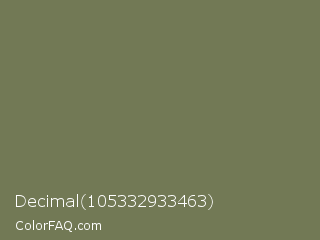 Decimal 105332933463 Color is a normal lime color and the nearest color is Crocodile #736d58. Hex code #727955 and RGB value is rgb(114,121,85). In RGB color space, this color is composed of 45% red, 47% green, 33% blue, In CMYK color space, this color is composed of 6% cyan, 0% magenta, 30% yellow , 53% black , In HSL color space, this color has a hue angle of 72° , 17% saturation and 40% lightness.