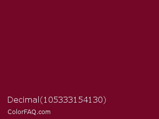 Decimal 105333154130 Color is a dark rose color and the nearest color is Black Rose #67032d. Hex code #730528 and RGB value is rgb(115,5,40). In RGB color space, this color is composed of 45% red, 2% green, 16% blue, In CMYK color space, this color is composed of 0% cyan, 96% magenta, 65% yellow , 55% black , In HSL color space, this color has a hue angle of 341° , 92% saturation and 24% lightness.