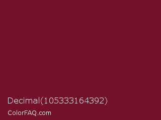 Decimal 105333164392 Color is a dark red color and the nearest color is Persian Plum #701c1c. Hex code #731028 and RGB value is rgb(115,16,40). In RGB color space, this color is composed of 45% red, 6% green, 16% blue, In CMYK color space, this color is composed of 0% cyan, 86% magenta, 65% yellow , 55% black , In HSL color space, this color has a hue angle of 345° , 76% saturation and 26% lightness.