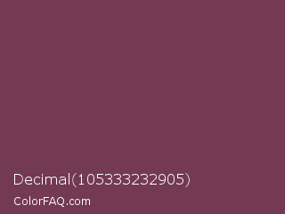 Decimal 105333232905 Color is a normal rose color and the nearest color is Cosmic #76395d. Hex code #733955 and RGB value is rgb(115,57,85). In RGB color space, this color is composed of 45% red, 22% green, 33% blue, In CMYK color space, this color is composed of 0% cyan, 50% magenta, 26% yellow , 55% black , In HSL color space, this color has a hue angle of 331° , 34% saturation and 34% lightness.