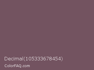 Decimal 105333678454 Color is a normal rose color and the nearest color is Russett #755a57. Hex code #735360 and RGB value is rgb(115,83,96). In RGB color space, this color is composed of 45% red, 33% green, 38% blue, In CMYK color space, this color is composed of 0% cyan, 28% magenta, 17% yellow , 55% black , In HSL color space, this color has a hue angle of 336° , 16% saturation and 39% lightness.